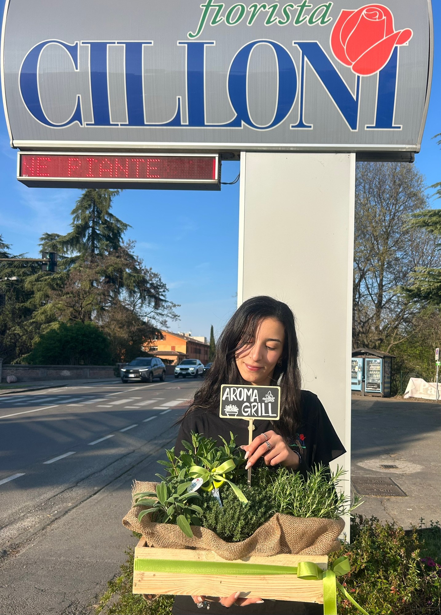 Realizzata in una cassetta di legno naturale rivestita in juta, questa composizione contiene un assortimento di erbe aromatiche fresche, ideali per insaporire carne, pesce e verdure. Il tutto è impreziosito da un fiocco decorativo verde e da una lavagnetta con la scritta “Aroma Grill”, che aggiunge un tocco rustico e accogliente.