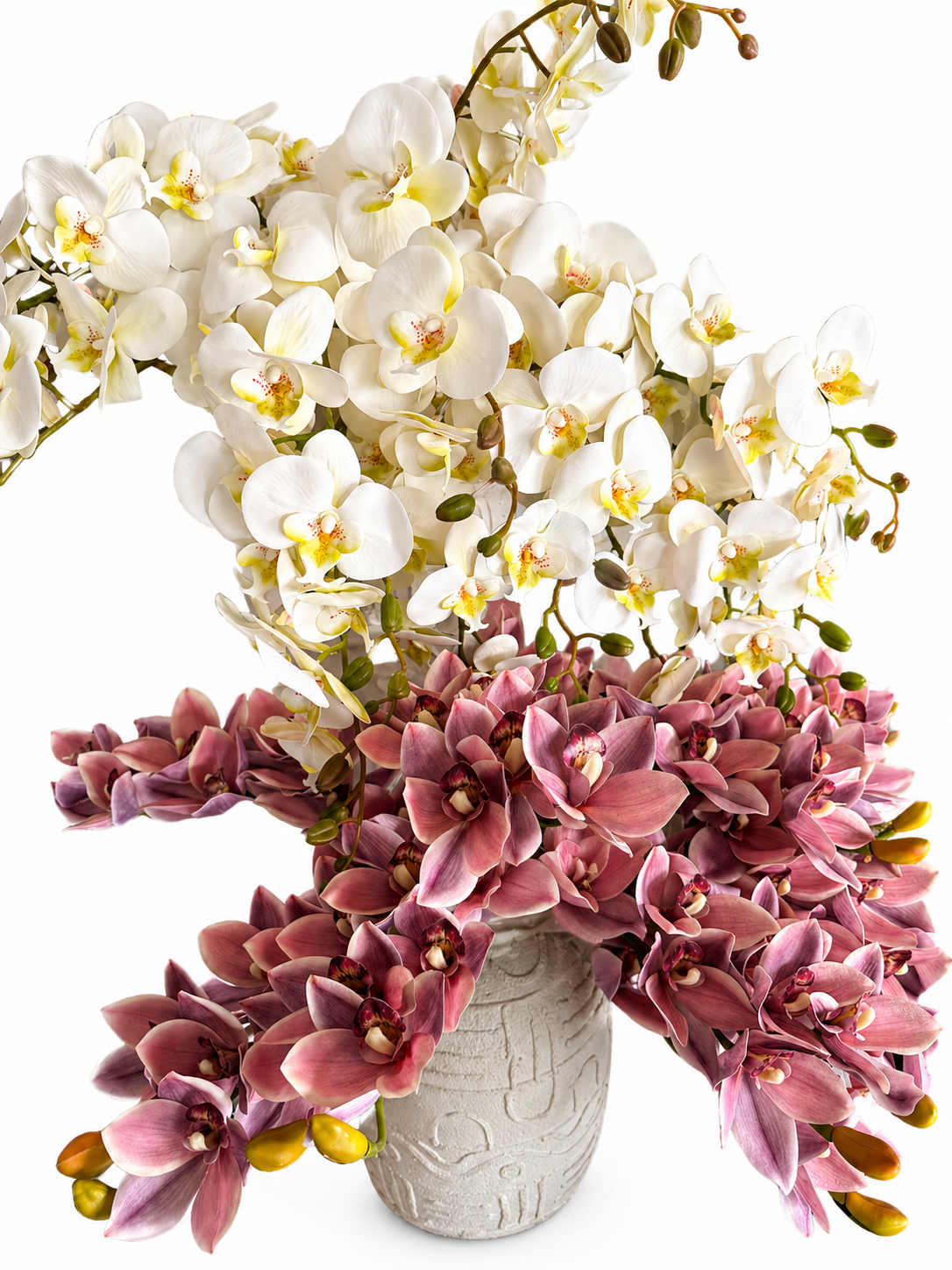 La composizione colpisce per il suo equilibrio perfetto: la solidità del vaso incontra la leggerezza dei fiori, creando un effetto scenografico di grande impatto visivo. Le orchidee, estremamente realistiche, catturano la delicatezza dei petali naturali, regalando luminosità e prestigio all’ambiente senza alcuna manutenzione.