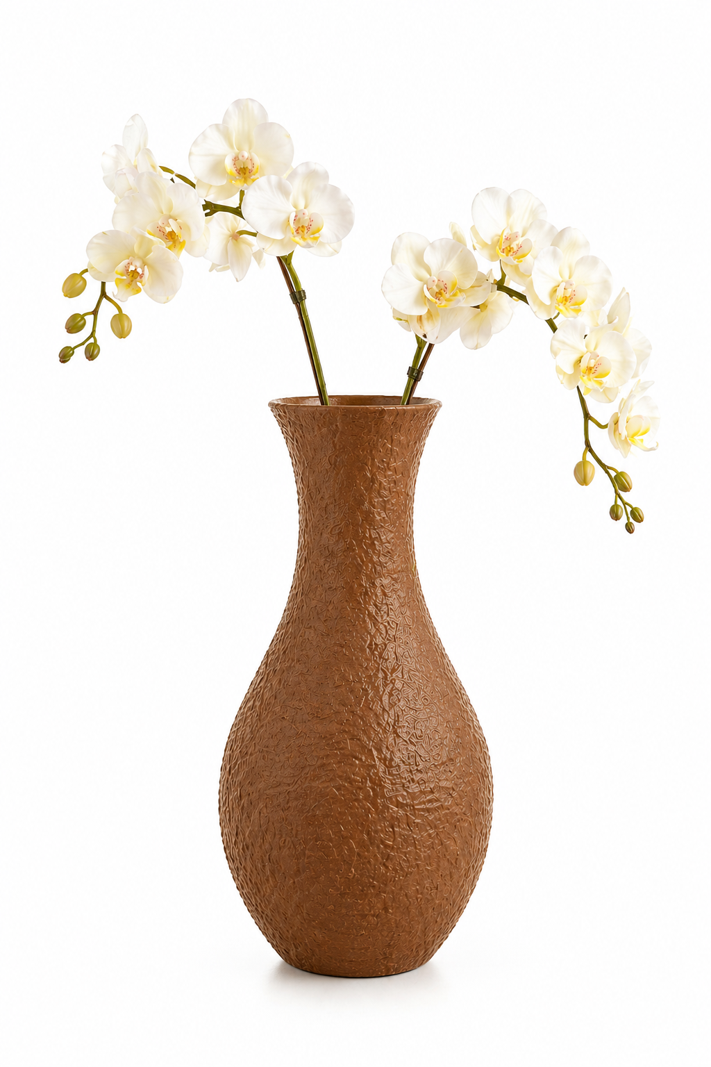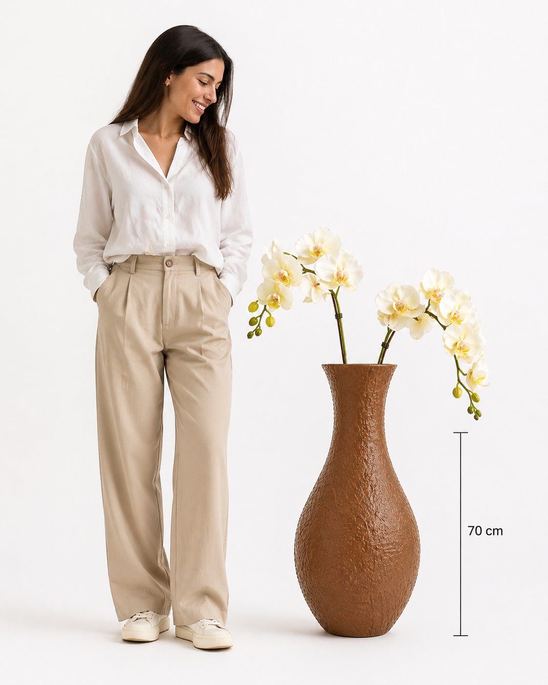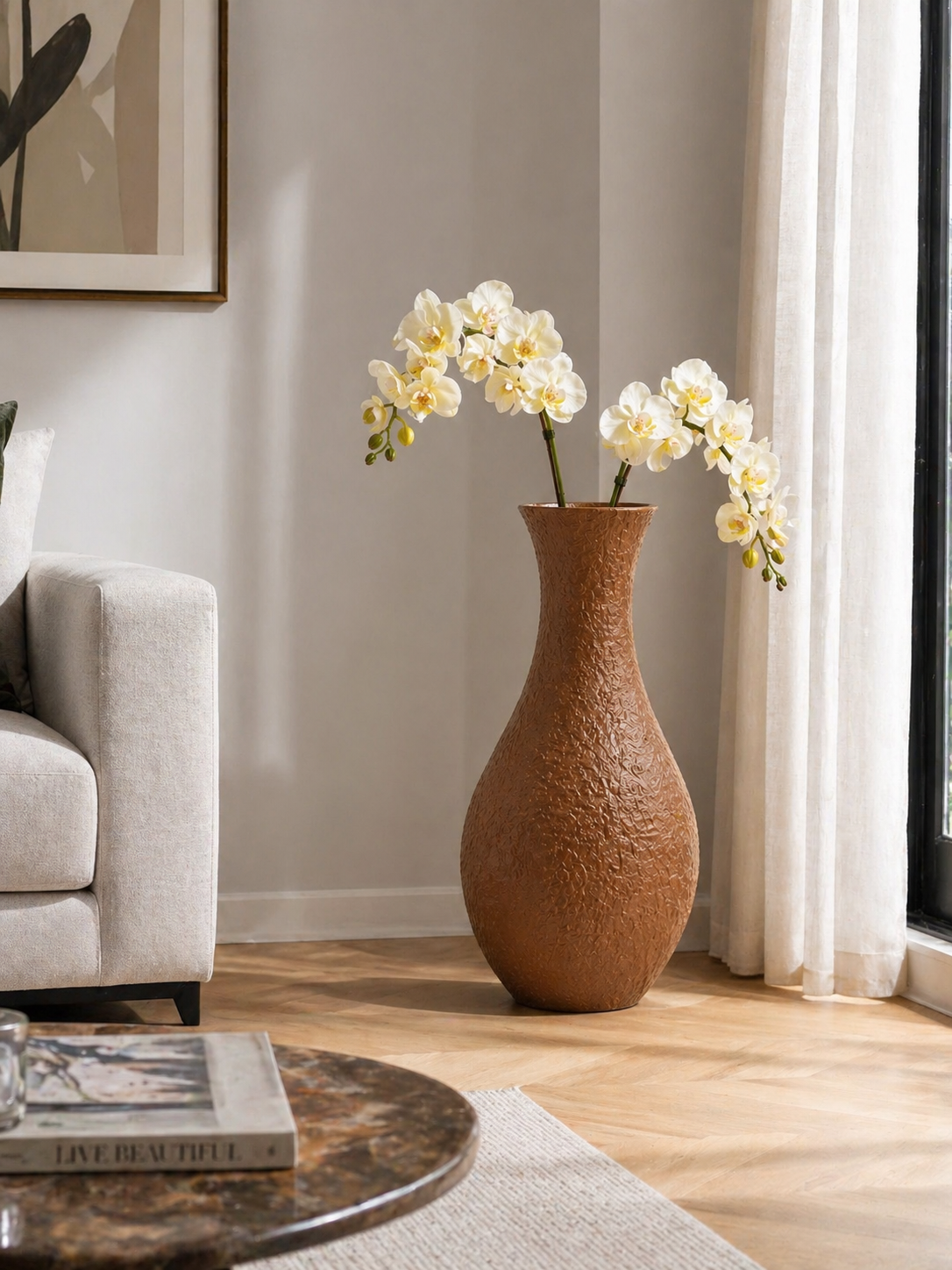 Un complemento d’arredo che non si limita a decorare, ma definisce lo spazio. Questo vaso alto 70 cm, dalle linee sinuose e dalla raffinata finitura materica color terracotta, accoglie armoniosamente rami di orchidea bianca, simbolo intramontabile di eleganza e purezza.