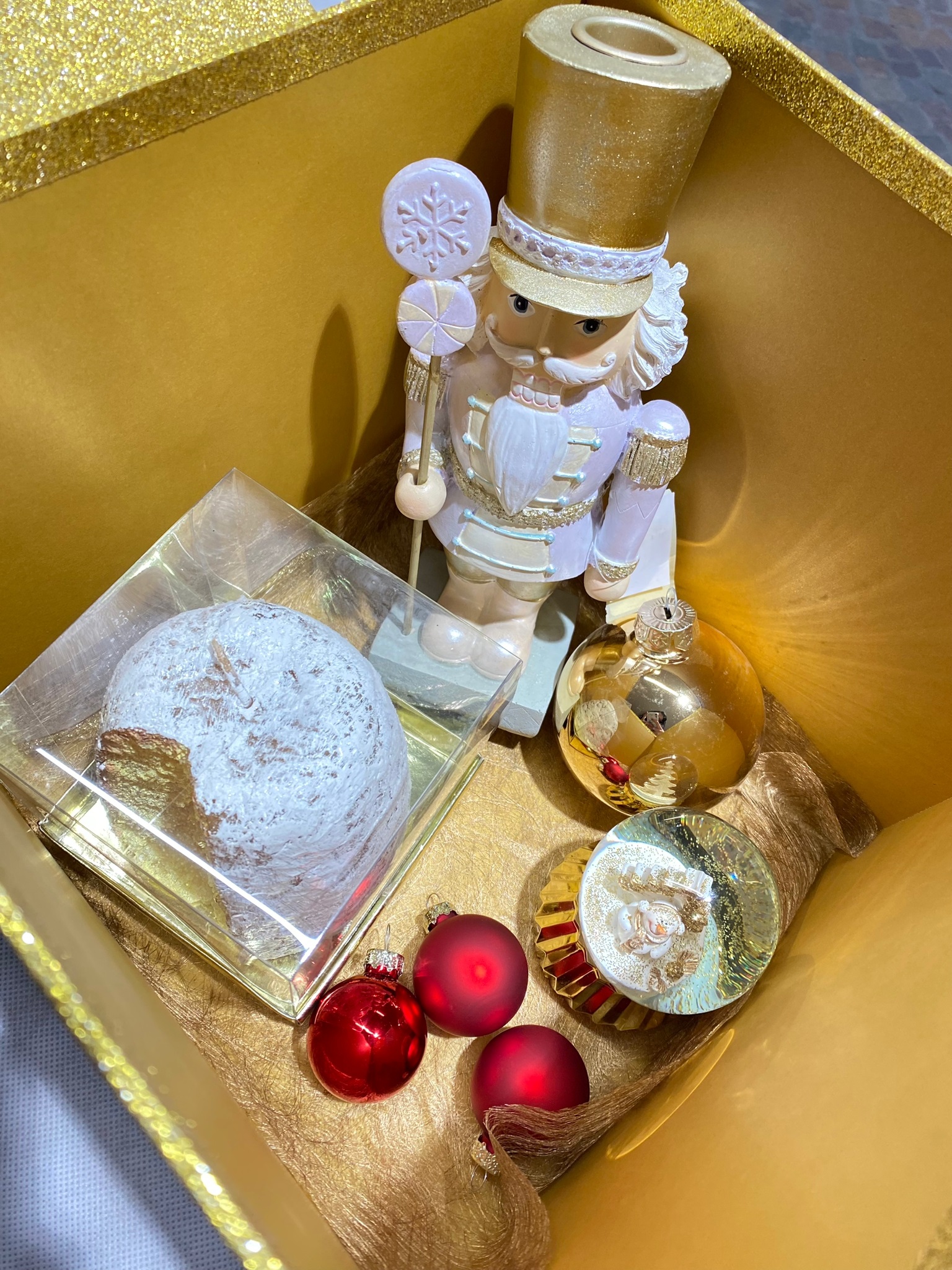 Scatola dorata con elementi Natalizi.