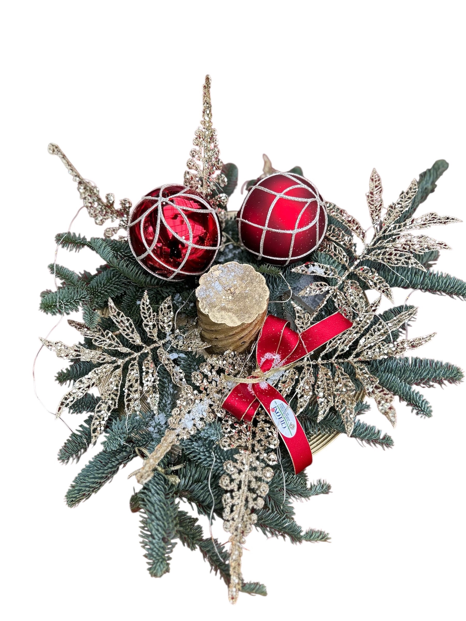 Centrotavola Natalizio con Pino, Palline Rosse e Decorazioni Dorate