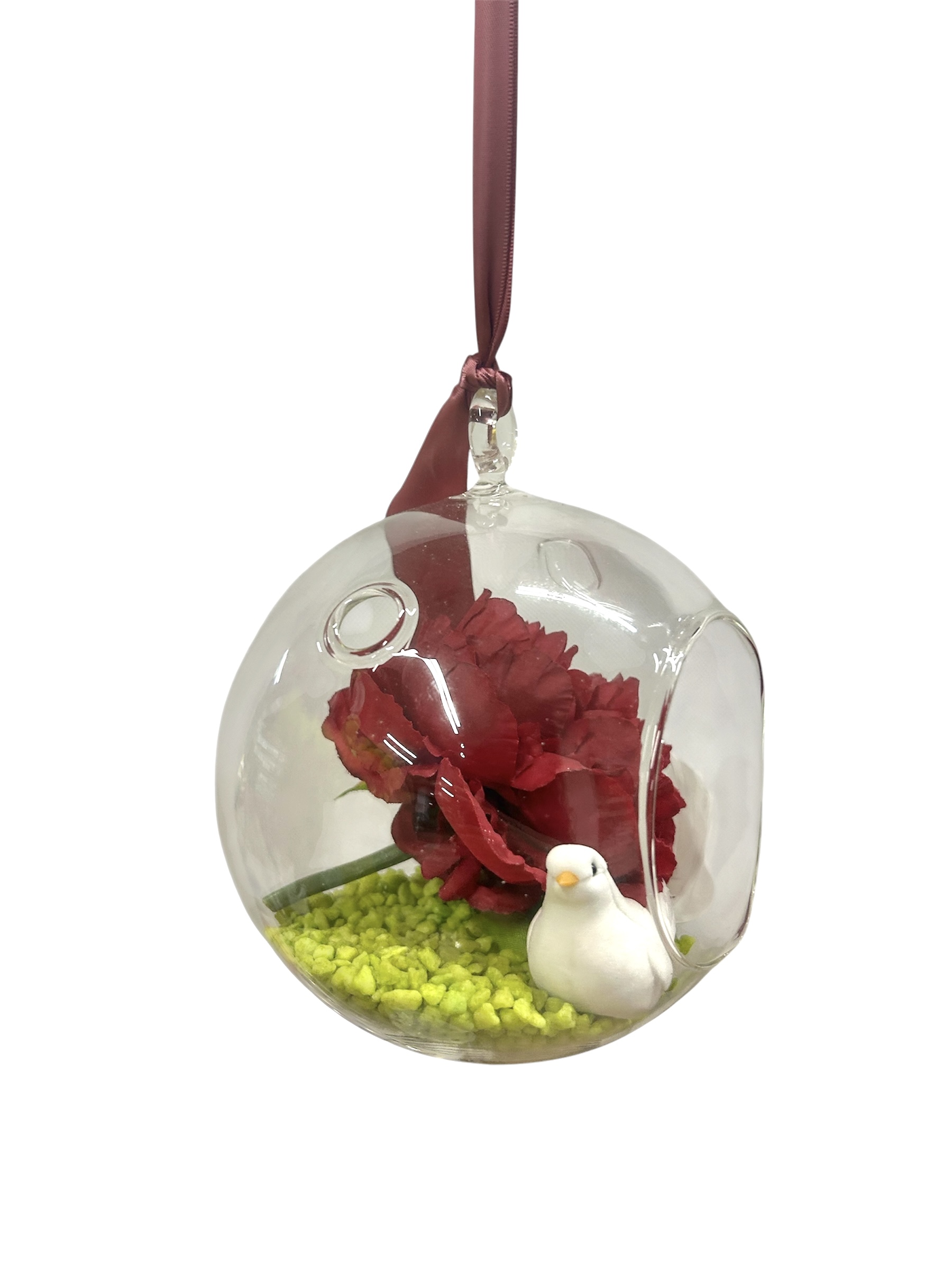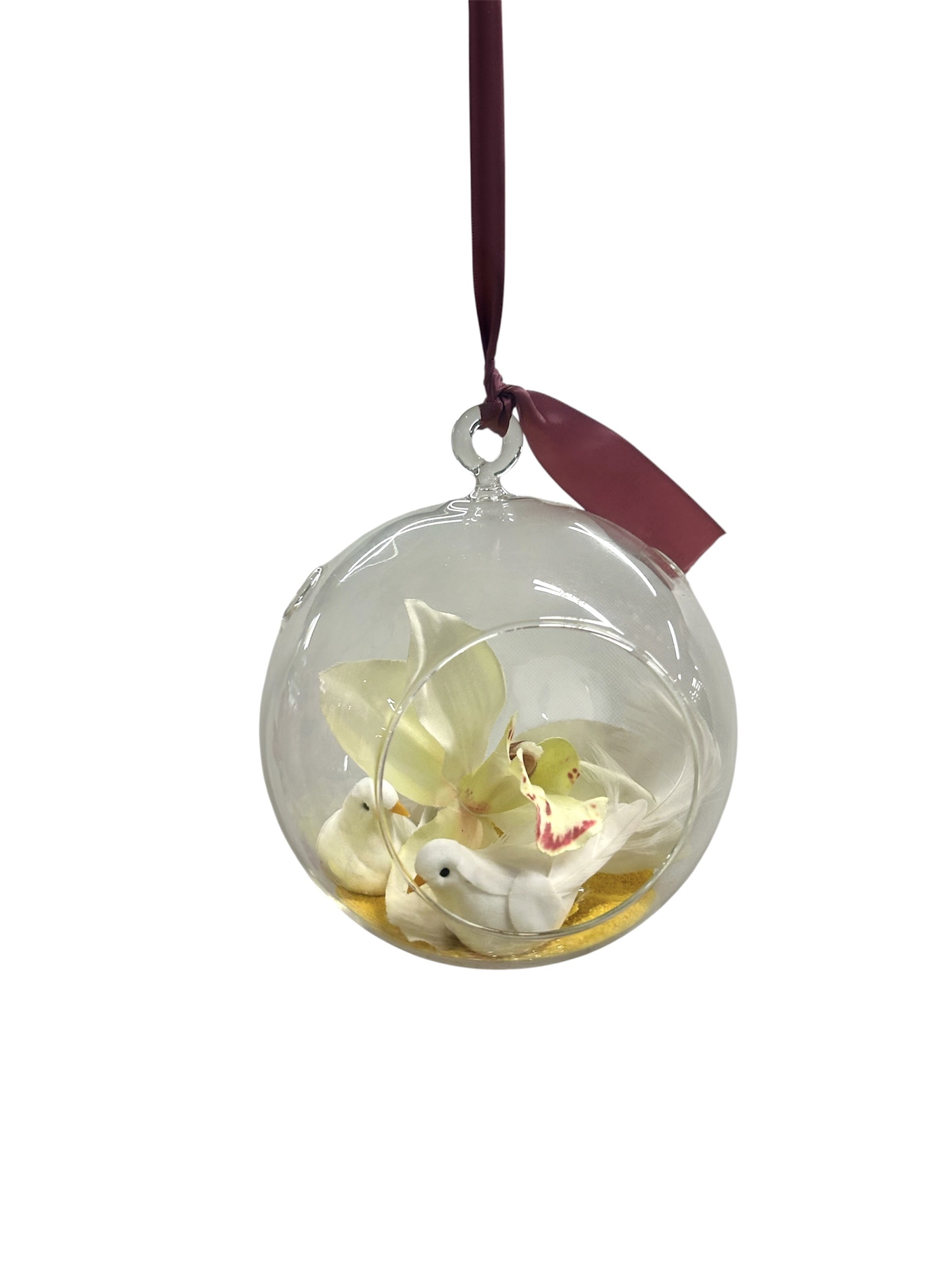 Aggiungi un tocco di eleganza e delicatezza ai tuoi ambienti con questa raffinata sfera decorativa in vetro trasparente. Realizzata con cura nei dettagli, racchiude al suo interno una composizione floreale impreziosita da piccoli uccellini ornamentali, creando un effetto scenografico romantico e suggestivo.