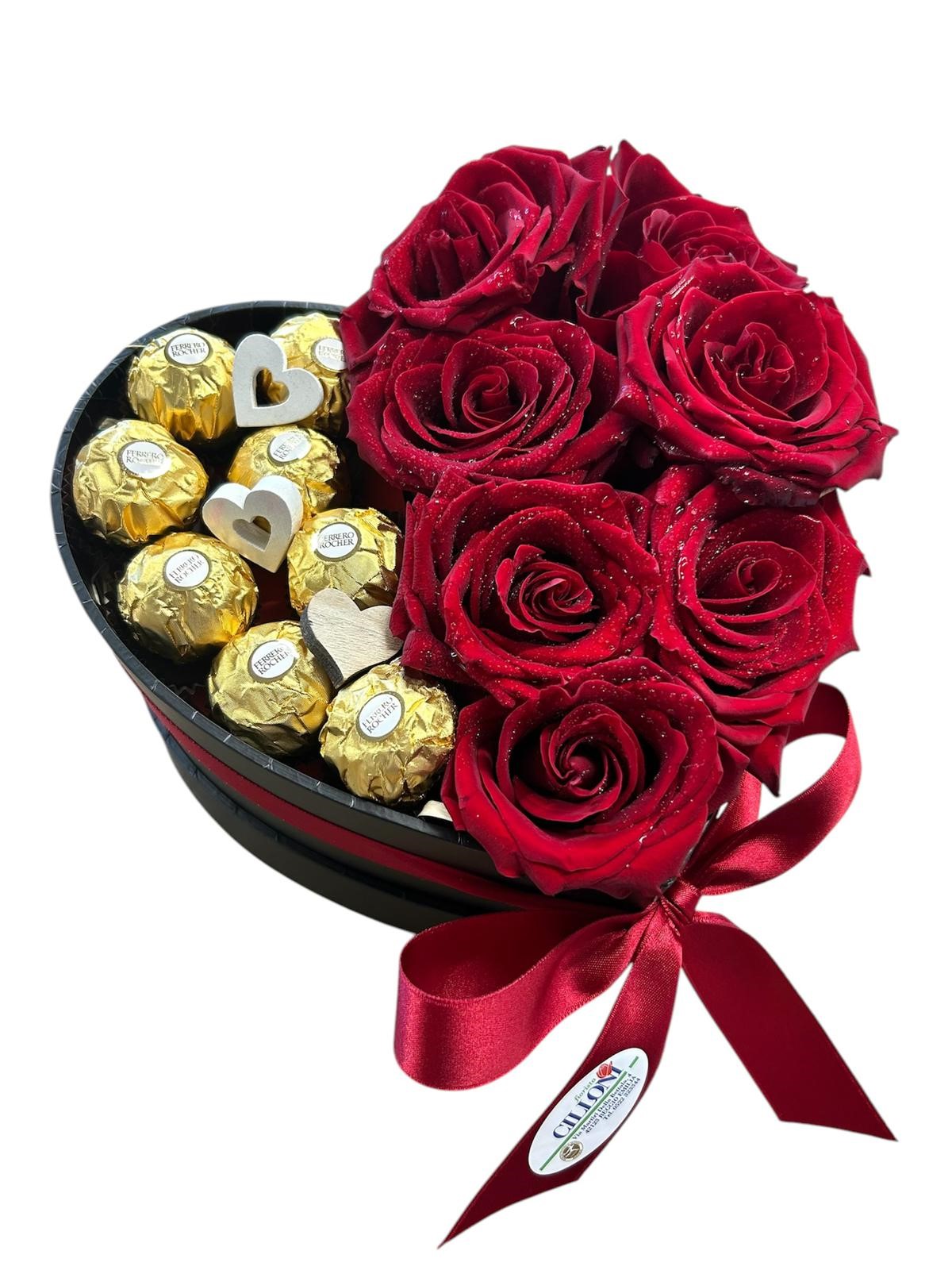 Cofanetto Ø14cm box da 3 Rose rosse fresche di altissima qualità inserite su spugna bagnata per una lunga durata, con aggiunta di buonissimi cioccolatini Ferrero Rocher.