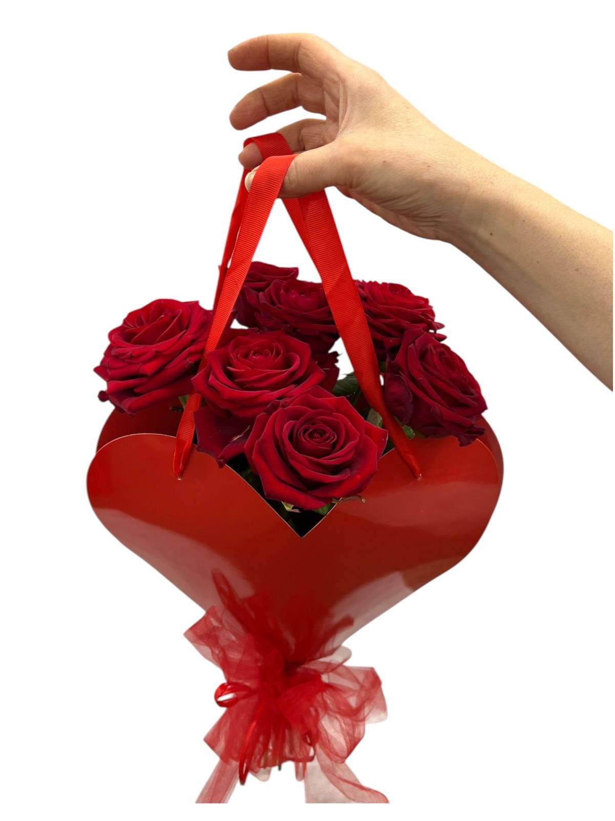 Bellissima borsa in cartone resistente con 7 rose rosse profumate di altissima qualità.